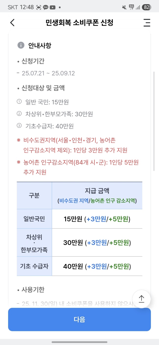 7. 신청기간, 신청대상 및 금액, 추가지급 지역과 사용 가맹점을 확인할 수 있습니다.