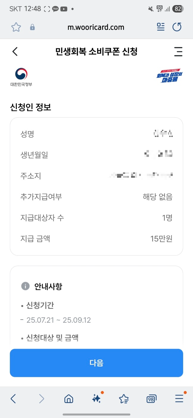 오늘(25년 7월 21일)부터 민생회복지원금을 신청받습니다.